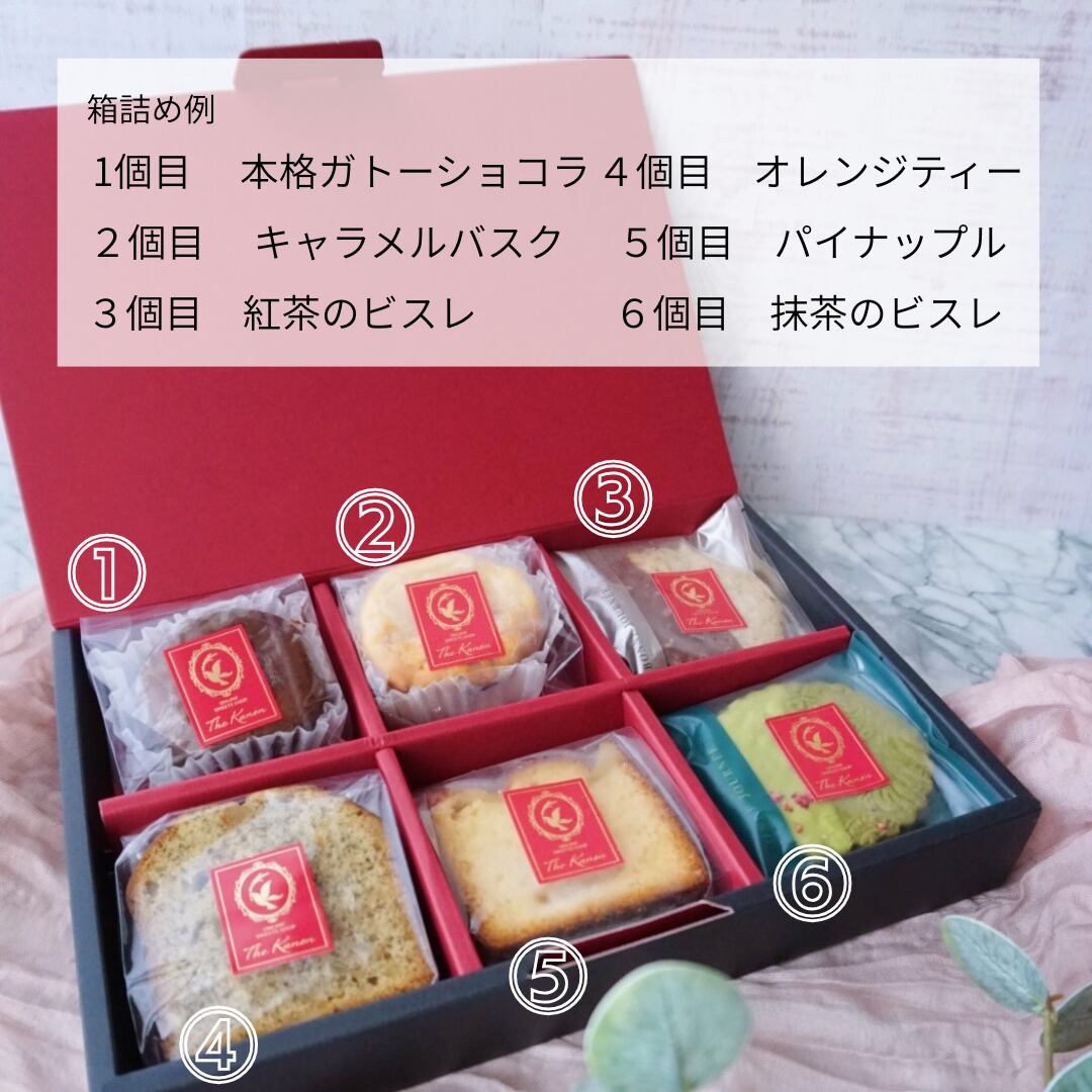 お好きなケーキ、パウンドケーキ、クッキーを自由に6個お選びいただき、プレゼントにも喜ばれる専用ボックスにお詰めしてお届けします。